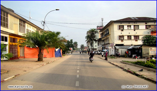Avenue Abbé Kaozi en direction du Nord-Ouest. Au milieu de la photo, le carrefour avec l'avenue de l'Eglise où l'on distingue le Congo Palace à droite.
