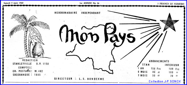 "Beaucoup de journaux sont nés dans les mois précédant l'indépendance, mais bien peu ont dépassé le premier numéro. Ci-après, un scan de "Mon Pays" de Sylvain Bondekwe qui a sorti plusieurs numéros. C'était un journaliste bien connu à Stanleyville mais il s'était fait des ennemis car il n'avait pas peur de dire la vérité. Ce malheureux a été excécuté sous Kinghis en août 1964 devant le monument Lumumba. Il est mort en criant 'Vive le Congo !' Triste fin pour un homme courageux."
